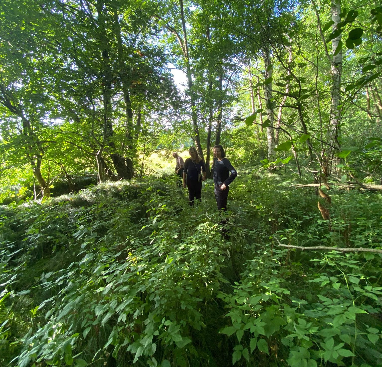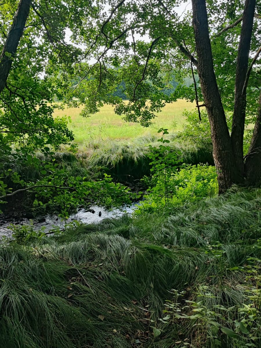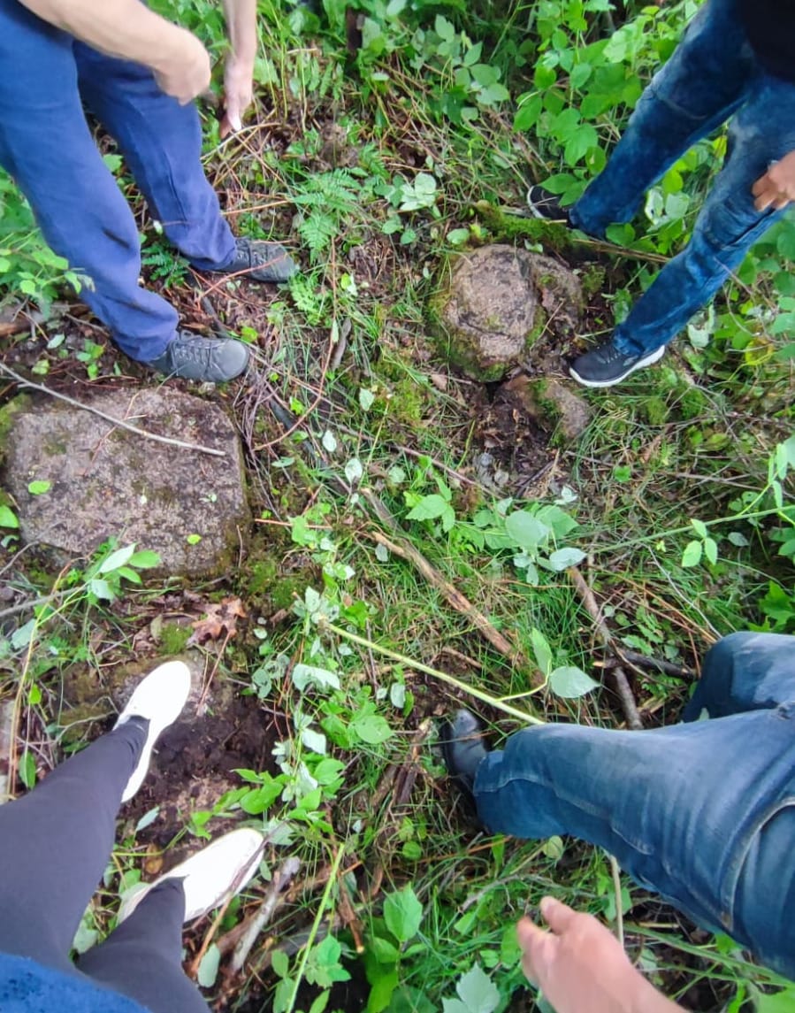 Und so machte sich unsere Historikergruppe am 18. Juli auf den Weg. Links am Sportplatz vorbei führte uns der Pfad durch ein altes, kaum genutztes Eisentor - mitten hinein in die Wildnis von Komptendorf. Zwischen wilden Himbeersträuchern und dichtem Grün suchten wir uns vorsichtig einen Weg. Dabei lichteten wir einige Ranken, bis darunter Steine sichtbar wurden, die offenbar einst den Ursprung des "Börnchens" eingefasst hatten.